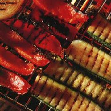 5.把牛排移入大浅盘中,包上铝箔保温。把蔬菜放到烤架上或烤盘中烧烤,至略焦黄和变软,期间翻动1次,刷2次剩余的腌汁。烤好后与牛排一同上桌。