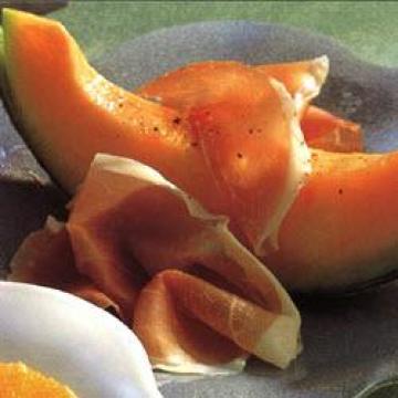1.在盘子里放1—2块罗马甜瓜、折叠得很雅致的薄意大利熏火腿片,撒上些现磨黑胡椒。无花果上市的时候,可以用每人两枚无花果来代替甜瓜。无花果切半,露出果肉,成簇地放在熏火腿旁。胡椒由各人自选。