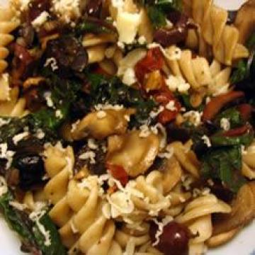 意大利螺丝粉500克,橄榄油2汤匙,厚皮菜(君荙菜)1把,去掉茎,菜叶切碎,油浸番茄干50克,切碎,无核黑碎橄榄100克,无核绿碎橄榄50克,大蒜末1汤匙,意大利帕马森干酪4汤匙,新鲜磨碎的