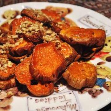 3.把红薯移到盘子里,撒上碎核桃仁,上桌趁热吃。