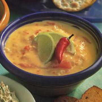大洋葱1颗,橄榄油2茶匙,中等大小番茄5个,墨西哥辣椒2根或盐水浸泡的墨西哥辣椒碎1汤匙,格洛斯特硬乳酪或赛达乳酪200克,二次分离稀奶油100毫升,盐、黑胡椒、塔巴斯科辣酱各少许,点缀:,红辣椒1根、,橘瓣形莱姆(青柠)2块,配菜:,玉米片、软墨西哥玉米饼或皮塔面包。