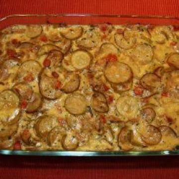 3.在碗里把打散的鸡蛋、奶油和意大利干酪搅拌均匀, 然后与起锅的胡瓜混合,放进事先抹了黄油的烤盘里。