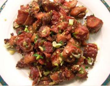 2.快火下油起锅,炒香猪颈肉至两面金黄,转中火煎至全熟,熄火,加入蜜糖炒匀,再切些薄片上碟,吃时伴汁料享用。