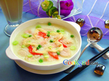 鸡蛋清120克,花枝片、澳洲带子、虾仁各15克,芝士片10克,鲜奶15克,青豆20克,葱花10克,红椒片12克。调料盐3克、味精3克,色拉油20克。