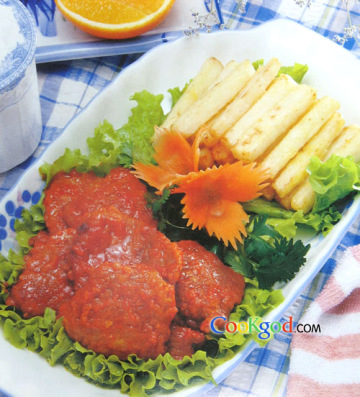 11.鲜番茄切成片与土豆条分别放在长盘两端便成。