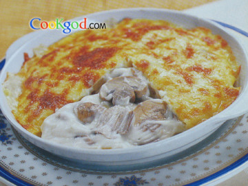 材料鲜蘑片400克,熟土豆、奶油少司各500克,芝士末50克调味料黄油30克,盐少许