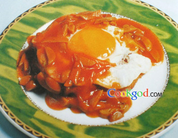 3、煎盘放橄榄油烧热,下圆葱碎、西芹碎炒出香味,加入口蘑碎、番茄沙司、盐、胡椒粉、调成汁,浇在蛋饼上即可。