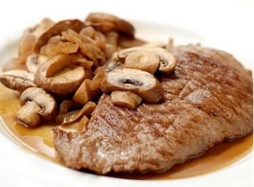 3.每块牛排上浇上做好的蘑菇汁就可以了。