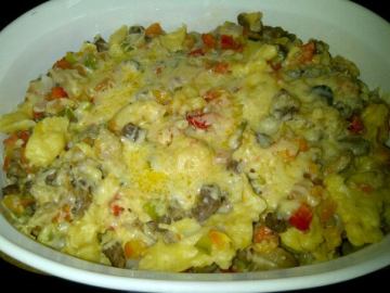 3、坐锅点火放入黄油炒化,加牛肉末煸炒,再放入西红柿、草菇粒、青红椒粒、洋葱末和煮好的面片翻炒片刻即可出锅。