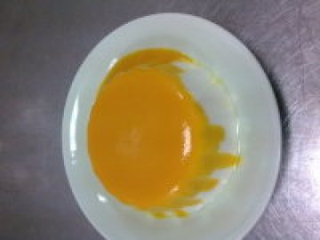 20、芒果果冻装入裱花袋里,裱花袋前端剪一个小口,在蛋糕片上画圈挤出一圈芒果果冻。芒果果冻要比蛋糕片小一圈。
