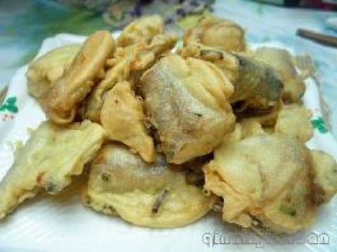 1.鱼去头切成段,裹上粉浆(生粉、面粉各一半,加上鸡蛋一只。)、葱花。