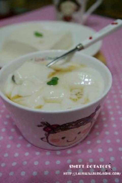 5.食用时,把容器内的凝乳用刀切成任何你喜欢的形状,再浇入冰镇的甜水,可以选择蜂蜜水、桂花糖水、白糖水都可以,还可根据个人爱好,将各种水果切成丁撒在上面同食。