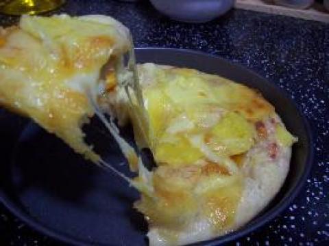6.番茄酱-芝士-香蕉片-芝士,依次铺好;(忘记加批萨草了:p)