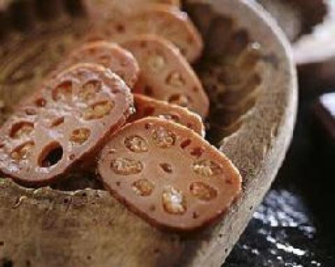 3.莲藕取出,待凉后切片,刷些蜂蜜汁,撒点桂花