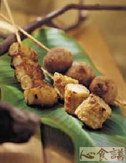 (3)将烤肉架放在火上,将炸好的材料放在火上,依食物大小刷上适当的调味料,必须注意烧烤时间,例如芋头丸子的油份已经逼出,只要再烤干表面即可食用。