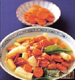 糖醋红萝卜1杯,花枝1/2斤,玉米笋6支,豌豆荚20个,蒜末1/2大匙,辣椒1支,1.盐2小匙,香油1/3大匙,泡菜糖醋汁2大匙,2.太白粉2大匙,水1/4杯