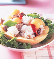 8.加太白粉水芶薄芡后,再加入作法4的花枝块、鸡肫及作法5的哈密瓜球一起拌匀后,即盛起放入作法6的哈密瓜盅即完成。
