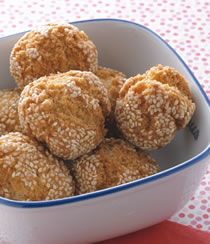 2.将作法1面糰揉匀后,分割成每个约12公克的小面糰,表面沾上白芝麻并搓成球型。