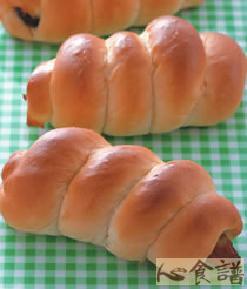 高粉250克,干酵母1小匙,奶粉10克,盐1/2小匙,糖25克,牛奶180克,香肠3根,黄油30克