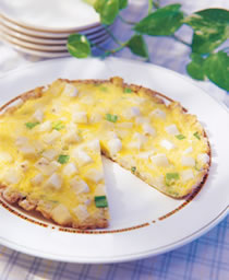(3)将平底锅预热,倒入油,将作法(2)的材料倒入,先用大火煎1分钟,再改小火慢慢煎,把所有蛋液煎熟,再装入盘子中,食用前可先切片,方便取用。