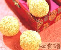 4. 将1份作法3稍微压平,包入1份红豆沙馅后,搓圆,再外表抹上少许的水,沾上一层白芝麻,再放入约180℃的油锅中炸至浮起时捞起沥干油脂即可。