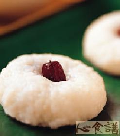 4.将作法3轻压成厚度1.5公分、直径6公分的圆形,中间用食指压出凹陷,放入一颗蜜红枣即可。