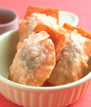 5.将作法2的虾泥分别舖放在作法4的土司片上,先放上一片香菜叶作装饰,再盖上馄饨皮,并轻轻的将四边压紧即可。