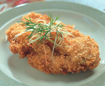 3.)取一中华锅,倒入约1/2锅的油量,以中火烧热, 将作法3的鸡胸排放入约130℃的油锅中后,随即转小火(约110℃的油温)炸约3分钟,再转中火炸约1分钟即可。