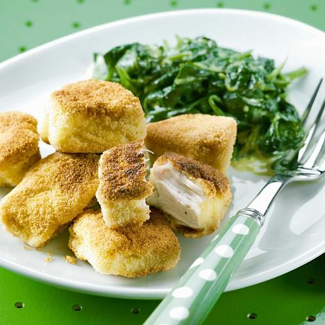 鸡肉块用料:鸡胸肉600g,(切成3cm大块),黄油,面粉各2汤匙(30g),玉米粉150g,鸡蛋2枚,盐1/2茶匙(3g),白胡椒粉1/3茶匙(2g),奶油咖喱菠菜用料:鲜菠菜叶500g,咖喱粉,黄油各1汤匙(15g),淡奶油180ml,盐1/2茶匙(3g),白胡椒粉1/3茶匙(2g)