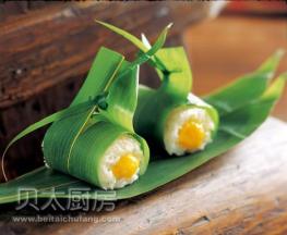 红薯 400g, 糯米 100g, 新鲜粽叶 5片, 白砂糖 50g, 盐 1g, 熟猪油 2汤匙