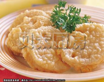 中火烧热炒锅中的油,待烧至六成热时(将手掌置于炒锅上方,能感到有明显的热气升腾),先将填好虾仁的藕夹均匀地蘸上一层面糊,再放入油锅中,用中火炸制成微黄色,约4分钟。