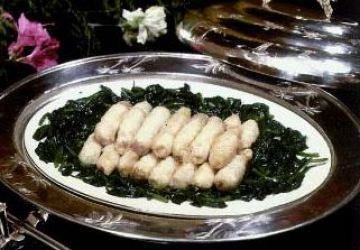 2、卷入火腿条,蘸全蛋糊后下入5成热油锅中炸熟捞出装盘,撒上花椒盐即成。