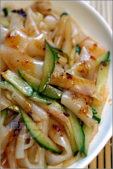3.切成自己喜欢的宽度,调配出自己喜欢吃的凉菜就可以啦:)偶放的是火腿+黄瓜丝+生抽+辣酱+醋+香油...吃哇...