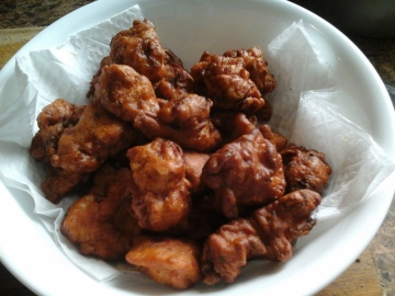 3.第一次炸用慢火低温油炸,炸至浅黄色,再将油调高温,再炸到金黄色,看见冰箱有几个蘑菇,就用蛋浆裹住蘑菇炸,不错的