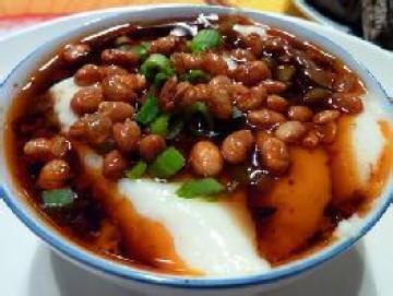 6. 把所有调料混合起来,豆腐脑入碗,淋上调料,撒上炸好的黄豆和葱花就好了。