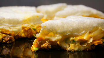 步骤6.将刚刚打发的蛋白用抹刀涂在烘蛋上。你可以考虑先把火关掉,等到将蛋白漂亮又均匀地涂抹在烘蛋上后,再开小火继续慢烘。