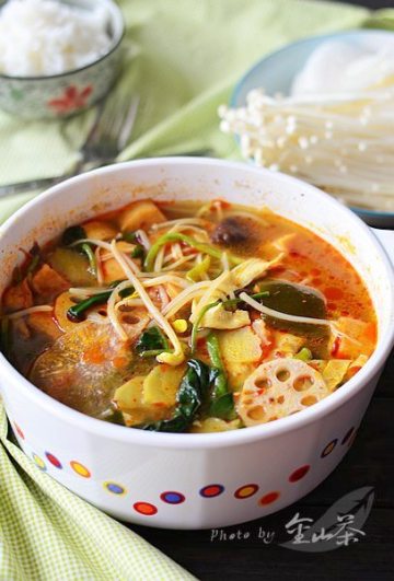 4. 金针菇和豆腐皮都不禁煮,所以要煮的时间短一些,扔进去翻个个就好了,不然一个煮烂了没口感,一个塞牙;