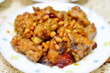 5。炸好的鸡块已经是金黄色,捞起吸干油汁;将花生米倒入油锅,炸一分钟即可,放置一旁;