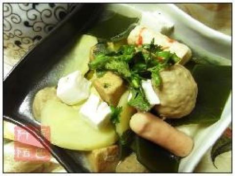 家乐浓汤宝1块,新鲜蔬菜,鱼丸脆皮肠,厚海带,魔芋菊花,土豆片