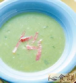 青豆仁150公克,培根20公克,马铃薯50公克,洋葱50公克,西芹30公克,红萝卜39公克,鸡汤500㏄,盐1/2茶匙