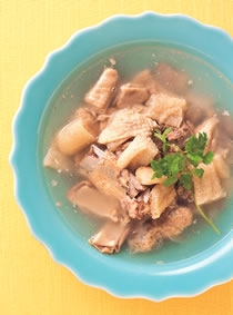 白萝卜120公克,排骨200公克,猪肚80公克,草菇50公克,姜片10公克,牛头牌豚骨汤块2块,米酒1大匙,水450㏄