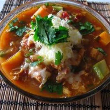 煮好的切成丝的火鸡肉200克,蔬菜或鸡汤1升,罐装整个小番茄400克,绿辣椒2个,切块,新鲜小番茄2个,切块,洋葱1个,切块,蒜头2个,压碎,青拧汁1汤匙,辣粉半茶匙,孜然半茶匙,现磨黑胡椒和盐适量,牛油果1个-去皮,去核,切成丁,新鲜胡荽1把,切碎,切达干酪100克,搓碎