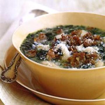 3.将一半白腰豆放入食物处理机,加几汤匙鸡汤。把腰豆打成泥状后倒回锅中,加入肉肠、菠菜、盐和胡椒。不盖锅盖,小火煮10分钟。拌入荷兰芹和柠檬汁,上桌前撒上奶酪。