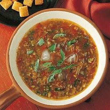 6.罗勒或薄荷叶洗净沥干,撕成碎片,加入汤中拌和,加足量盐、黑胡椒调味。其味应浓烈、爽口。