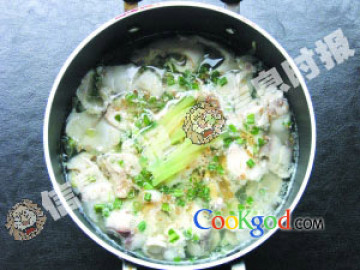在广州觅食地图上比较有名的番禺灯塔吧,有一道每桌必点的名菜——鲩鱼二吃,鱼肉片成极薄片,摆碟,先端上一煲靓高汤,当着你的面浸入鱼片,无需盖盖,静置一、两分钟,即可食用,鲜嫩清甜。剩下的骨腩用来香炸,是下酒佳品。今天不妨也试做个浸鱼片汤吧,用爽口的莴笋丝垫底,荤素搭配,营养更合理。3-4人份莴笋:1条(约100克)鲩鱼肉:200克熟白芝麻:少许葱:1条水:5碗调味料:油:1汤匙 鸡粉:1/3汤匙 白胡椒粉:少许 香油:几滴 盐:适量