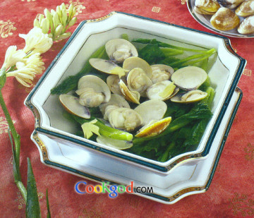 车螺250克,芥菜150克,姜丝10克,鸡精1/2茶匙,盐1茶匙,二汤1250克。