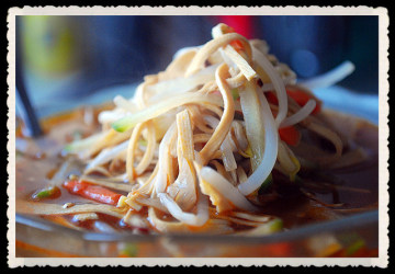 1、爆锅后,炒豆芽、干豆腐丝、萝卜丝,然后加水;