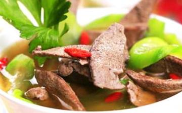 2、热油锅里放姜丝炒哈加水,烧开放入丝瓜、猪肝,煮过4分钟(煮的过程中不能加锅盖,加了盖子,丝瓜会发黄)加枸杞、盐、鸡精和香油几滴即可。