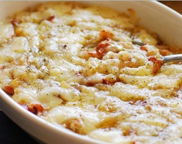 5.然后盛在烤盆里,撒上碎芝士,烤箱预热210摄氏度,烤10分钟就可以了。