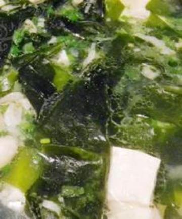 原料:豆腐丁、滑子蘑、葱花、裙带菜、味淋、味之素。
